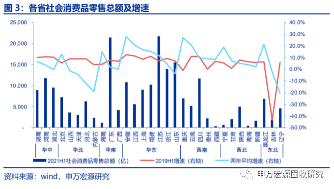 社会消费品零售总额方面,共15个省份的增速高于2019H1,其中12个分布在华东、西南地区,山东、浙江两省消费品零售总额靠前但增速较低;华中、华北、华南增速普遍回落;西北、东北地区内部增速有所分化。上半年,华东增速普遍提升,除山东、浙江外,其余省份增速均高于2019H1,且增速均在10%以上,山东、浙江两省虽然社会消费品零售总额规模靠前,但增速略低。西南地区中,除四川外,其余省份增速均大幅提升,重庆、云南增速在20%以上。华中、华北、华南增速普遍回落,除北京、海南外,其余省份增速均低于2019H1。西北、东北地区内部增速有所分化,甘肃、宁夏、黑龙江、吉林三省增速有所提升。
