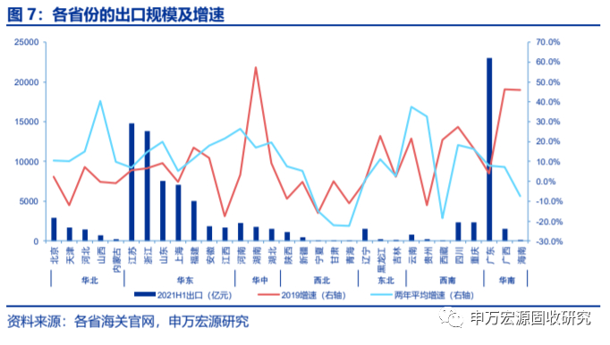 出口方面,21个省份出口增速提升,广东、江苏、浙江、山东等东部沿海省份在高出口量下维持高增长;西北、西南、东北地区出口量较低,但半数省份两年平均增速高于2019H1。