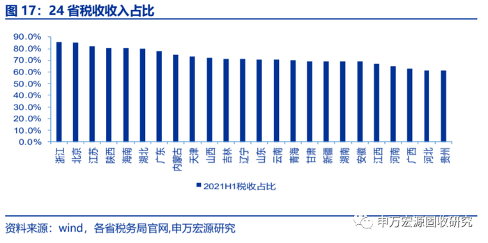 从公布税收收入的24个省份的税收占比来看,大部分省份税收占比在80%以下,各省份收入质量存在差异。上半年,仅有浙江、北京、江苏、陕西、海南、湖北共6个省份的税收占比在80%以上,广东、内蒙古、天津等9省在70%-80%之间,其余9省在60%-70之间,贵州、广西、河北三省不足65%。