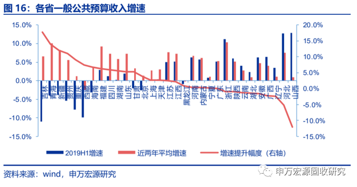 24省一般公共预算收入增长提速。从总量来看,各省一般公共预算收入与其GDP规模相对匹配。从收入增速来看,除黑龙江、西藏外,其余省份两年平均增速均为正;24个省份两年平均增速超过2019H1增速。