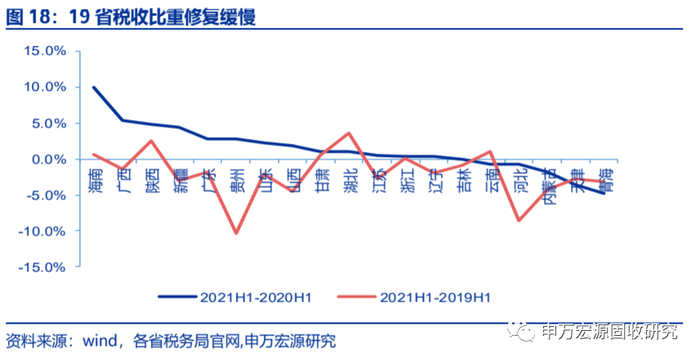 收入结构修复缓慢,增值税增速低于其他税种。19个可得数据的样本省份中,海南、陕西、甘肃、湖北、浙江、云南6省收入结构修复较快,税收占比高于2019年同期,其中湖北提升最大为3.6个百分点;其余省份虽然大部分税收占比高于2020H1,但仍低于2019H1。