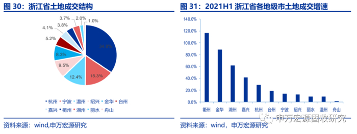 浙江省国有土地使用权出让收入增长至4585亿元,两年平均增速高达21%,主要系三线城市土地出让收入增长。根据克而瑞土地成交数据,上半年浙江省土地成交占比较重的杭州、宁波两市较2019H1增速下滑,而嘉兴、衢州、金华、湖州、温州、绍兴六市土地成交增长较快,合计占比41.8%,合计同比增长54.1%。