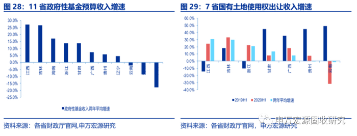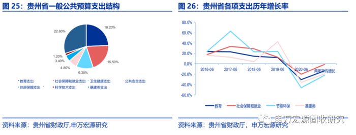 上半年支出增长较低主要是基建类支出负增长。以一般公共预算支出增速回落最多的贵州省为例,其基建类(农林水支出、交通运输支出、城乡社区支出)、教育类、社会保障和就业等占比较重的支出项目均为负增长,两年平均增长率分别为-19.6%、-13.5%、-0.8%。