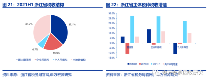 以一般公共预算收入增长最快且收入结构修复较好的浙江省为例,浙江省相比于2019H1税收收入增长22%,其中,企业所得税增长24.8%,增值税增长13.5%。此外,受2019年减税政策等导致的低基数影响,2021上半年浙江省个人所得税增长18.8%。