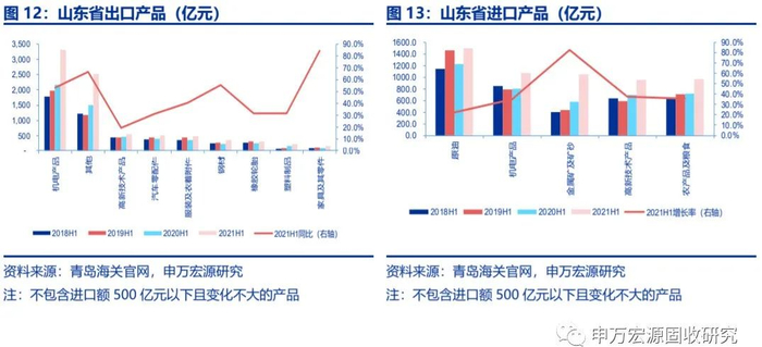 分地市来看,除滨州、菏泽、德州外,其余地市进出口总额的两年平均增速均高于2019H1增速,临沂、济南增长最快,青岛、烟台在高体量下依旧高增长。临沂、济南两市增速分别为33.5%、30%,增长最快;青岛、烟台在3975、2033亿元的进出口总额下分别保持19%、22%的高增长。