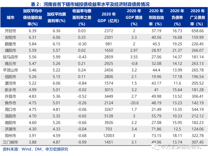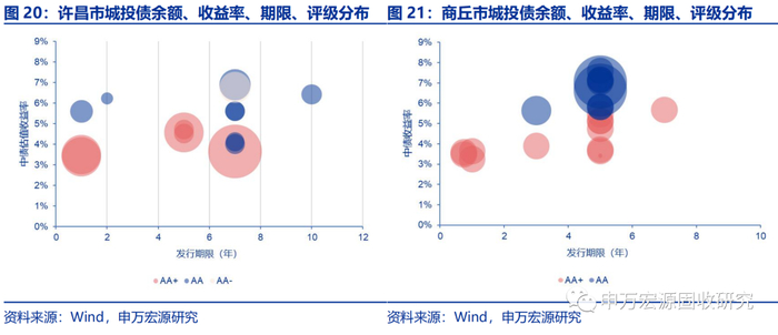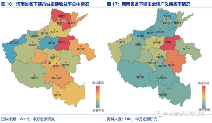 我们以收益率与广义债务率的比值作为城投债投资的“夏普比率”,以此来衡量每座城市城投债的投资“性价比”。收益率与广义债务率之比较高的城市有安阳市、济源市、焦作市、驻马店市、新乡市;收益率与广义债务率之比较低的城市有周口市、开封市、郑州市、三门峡市、许昌市。