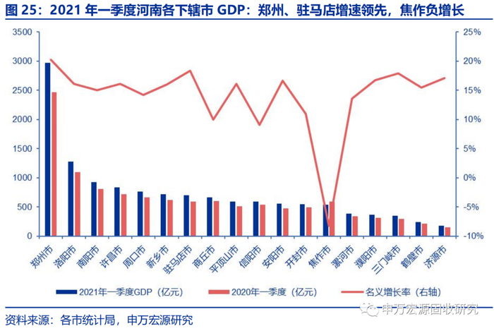 综合来看,三门峡市和周口市的城投债收益率较低,且两市广义债务率较高,配置性价比相对不高;开封市收益率高但债务负担重;济源市较高的“夏普比率”主要得益于其广义债务率低,但在河南省整体信用风险可控的大环境下,济源市城投债的收益率不具备足够的吸引力。焦作市收益率尚可且债务率低,但其大幅下滑的GDP增速值得警惕:2020年焦作市GDP增速为-20.6%,退出GDP百强城市;2021年1季度,焦作GDP维持负增长,名义增速为-8.19%。焦作GDP大幅滑坡的背后,有挤水的因素,也有资源枯竭型城市和传统煤炭城市在“碳达峰”时代可持续发展的隐忧。