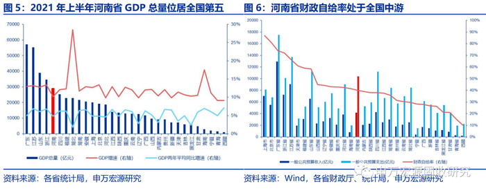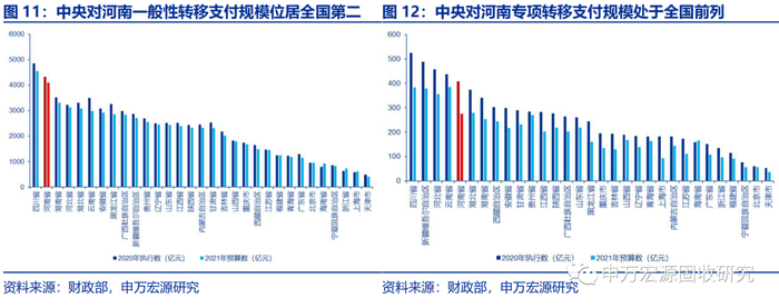 转移支付方面,中央对河南的支持力度很大。中央对河南的一般性转移支付2020年执行数为4323.69亿元,2021年预算数为4105.79亿元,二者均居全国第二;中央对河南的专项转移支付2020年执行数为408.82亿元,处于全国第5位,2021年预算数为275.54亿元,处于全国第6位。河南地处中原腹地,是我国“中部崛起战略”的重要一环。今年7月22日发布的《中共中央 国务院关于新时代推动中部地区高质量发展的意见》(以下简称《意见》)提出:“中央财政继续加大对中部地区转移支付力度,支持中部地区提高基本公共服务保障水平,在风险可控前提下适当增加省级政府地方政府债券分配额度”;《意见》还多次点明河南郑州的中心城市定位:“加快郑州、长沙、太原、宜昌、赣州国家物流枢纽建设”,“支持武汉、长株潭、郑州、合肥等都市圈及山西中部城市群建设”,“加快武汉、郑州国家中心城市建设”,“加快推进郑州国际物流中心、湖北鄂州货运枢纽机场和合肥国际航空货运集散中心建设,提升郑州、武汉区域航空枢纽功能”。
