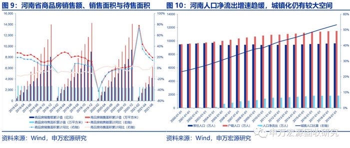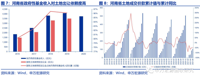 政府性基金方面,河南省2020年政府性基金收入为3751.9亿元,处于全国第6位;从政府性基金收入的构成来看,国有土地使用权出让金是河南政府性基金收入的主要来源。2020年河南省国有土地使用权出让金收入暂未公布,但参照2016-2019年的数据,河南省国有土地使用权出让金占政府性基金收入的比重都在80%以上,政府性基金收入对土地出让依赖度较高。从土地成交价款来看,2016年以来,河南省土地成交价款总体保持平稳,2021年上半年土地成交价款同比有所回落。从商品房销售来看,2020年疫情前,河南省商品房销售额与销售面积整体呈现平稳较快增长;商品房销售额与销售面积在疫情期间回落,并在今年年初出现反弹;商品房待售面积总体稳定,呈现出缓步下降的趋势。从土地需求的长期潜力来看,河南省常住人口基本稳定,户籍人口增速放缓;河南自1995年以来维持人口净流出的状态,近年来人口净流出增速趋缓;河南省城镇人口比重维持较快增长,河南省政府工作报告预计河南2020年常住人口城镇化率达到54.2%,但仍低于同期63.89%的全国平均水平,河南省的城镇化进程仍有较大空间。