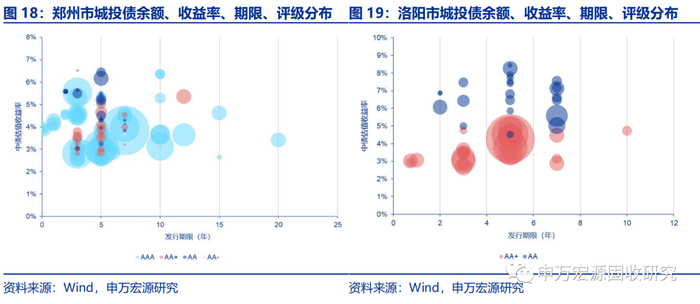 我们以气泡图的形式呈现河南省城投债余额规模较大的6座城市存续城投债的余额、收益率、期限和评级的分布情况。图中每个气泡代表一只城投债(不含PPN),气泡的横坐标为发行期限,纵坐标为中债估值收益率,气泡大小代表了债券余额,气泡颜色则区分了城投主体评级。从城投债的存续规模来看,郑州城投债存量占河南省城投债存量的一半以上,达1821亿元,是第二名洛阳市的4倍多。从主体评级分布来看,河南省所有AAA评级城投主体均位于郑州市;洛阳市、许昌市、商丘市、平顶山市、焦作市、南阳市、三门峡市、新乡市、周口市和驻马店市的城投债主体评级以AA+为主;安阳市、鹤壁市、济源市、开封市、漯河市、濮阳市和信阳市的发债主体则主要为AA评级。从发行期限来看,5年期占比最高,其次为3年期;三门峡市以余额为权重的加权平均期限最短,为2.83年,其次为漯河市和信阳市;开封市的加权平均期限最长,为7.36年,其次为新乡市和驻马店市。