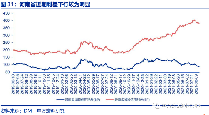 永煤事件使得河南城投利差快速走阔并连续几个月维持高位,随着永煤事件逐步平息,一、二级债券市场回暖,五月份以来河南省利差下行较为明显。