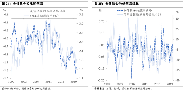 期限溢价和期限利差不完全等同,但走势基本接近,可以互为参考依据。信用债难点在于中国没有丰富的衍生品市场,债券收益率隐含的通胀预期、政策利率等预期只能依据模型来拆分。美债隐含长期通胀预期与5年,5年远期通胀率走势接近,债券收益率隐含的意外通胀率与调查得出的花旗经济意外指数也是匹配的。