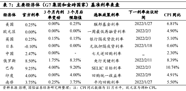 主要经济体通胀和货币政策跟进:美国11月CPI同比录得较10月上涨0.59%,达到6.81%,创1982年来最高水平, 主要原因仍是消费者对商品的强劲需求和供应链瓶颈,能源、食品和住房价格的上涨主导了通胀持续上行。受同样原因影响,发达经济市场中英国和欧元区也出现了不亚于美国的价格水平上涨,CPI同比较10月分别上涨0.9%、0.6%,金砖国家中的中国、印度、南非CPI同比也处在上行状态,俄罗斯和巴西CPI维持在高位但较上个月变化较小,通胀上行可能受制于逐步加码的加息政策,日本仍处在弱通胀水平。主要经济体中,英国、俄罗斯、巴西分别上调基准利率0.15个百分点、1.75个百分点和4个百分点,市场调查对未来三个月这三个国家的货币政策有降息预期,其他国家基准利率均维持上月水平,市场三个月预期值也与当前持平。
