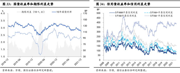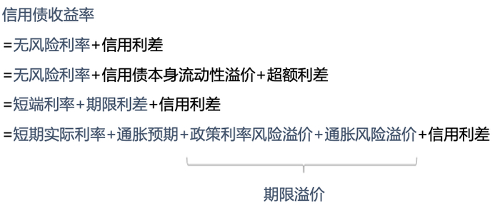 信用债收益率可初步拆解为短期实际收益率、通胀预期、通胀溢价和信用利差。前两者分别是债券投资者对未来政策利率和通胀的预测,期限溢价则表示随着债券期限的拉长,投资者对其隐含的通胀和政策利率不确定性所寻求的补偿,信用利差可拆分为信用债本身流动性溢价和超额利差。