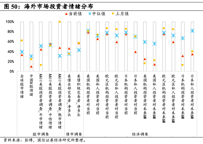 海外市场方面,我们测算了AAII、Sentix等口径投资者情绪指数,12月底海外投资者对中国A股看好情绪较11月末进一步下滑,对全球股市看好的情绪较上个月以及过去一年的月度中位值也大幅下滑。美国机构投资者和个人投资者对当前的经济较为看好,但看好程度弱于上月,欧元区、日本的机构投资者对当前经济比较乐观,但个人投资者乐观情绪较上月均下降较多。欧洲投资者对未来半年经济都处在看好的状态,美国和日本投资者较为悲观。