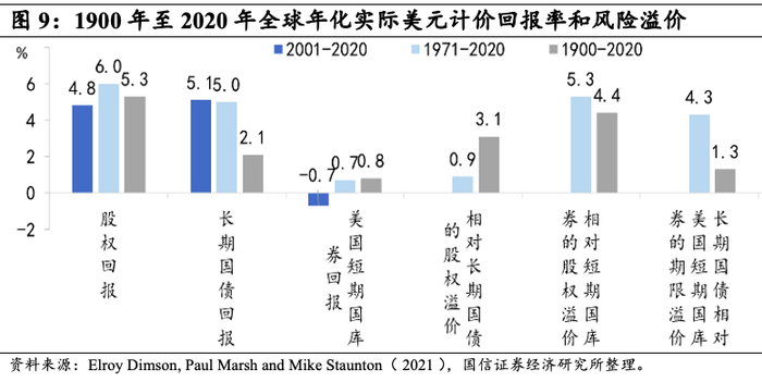 过去120年间全球股票的风险溢价约为4.4%。Credit Swiss编制的世界股票指数和债券指数,分别涵盖90个国家和32个国家,代表了一个特定国家的投资者对全球多样化投资组合的长期回报。从美元计价资产全球投资者的回报率和风险溢价可以发现,在过去的120年里,全球股票年化实际回报率为5.3%,债券为2.1%,股票相对于短期国库券的年化股票风险溢价为4.4%。