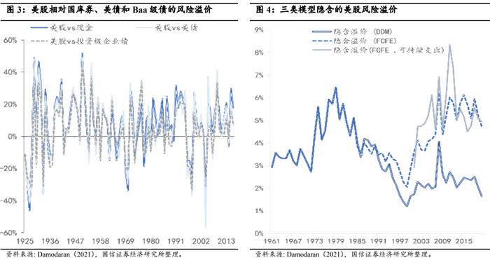 艾斯沃斯·达摩达兰是纽约大学斯特恩商学院的金融学教授,是全球最知名的股市估值专家之一。根据达摩达兰的测算,选取不同债券资产(国库券/现金、长期国债、投资级企业债)为锚测算的美股期限溢价大体相同。另外,FCFE模型隐含的美股风险溢价要高于DDM模型。