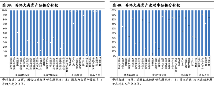 中国和全球市场股、债、汇、商价格、波动率所处在过去五年的分位点显示:(1)从价格角度考虑(债券收益率视为价格反向指标),国内市场的股/债/商估值整体偏贵,商品中除农产品外其他品种估值均高于前期,贵金属估值仍相对较低。股票中金融、消费和稳定的估值停止了之前的下行趋势,整体小幅回升,周期、成长维持高位。债券和商品波动性普遍减弱,股票中金融、周期波动性减弱,其余品种波动性上升显著。(2)全球市场方面,股票市场中,英国的富时指数估值较11月有所回升,回到70%以上的历史分位数,中国香港的恒生指数估值继续维持在低位,其他市场股指均位于过去五年间90%以上的分位值,全球各类债券估值较11月呈现不同程度的上升,其中欧美及全球高收益债估值分位数上行较为显著,相较之下美国国债和MBS在市场众多债券中价格适中。