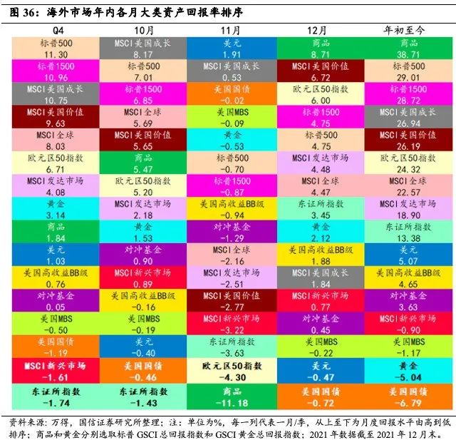 2021年12月海外大类资产大体排序:商品>股票>债券/美元。前三甲的品类:商品、美国价值股、欧元区50指数。(1)12月多数资产表现较11月有显著改善,仅美国MBS、美元、美国国债录得负月度回报率,大宗商品价格强势反弹登顶回报率排行榜首位,美国价值股次之,标普500指数和标普1500指数均录得4.75%的月度回报率。美国CPI同比继续增长至6.8%的高位上,开始出现成长向价值的风格偏离,成长股仅录得1.84%的月度回报率。(2)分区域来看权益市场:美国/欧洲>日本>新兴市场。新兴市场受外资回流、变异病毒扩散等诸多因素的影响表现低迷,而受强劲的零售数据和缓和的疫情担忧提振,叠加圣诞效应欧美股市表现较好。(3)债券方面,分品种看:高收益债>MBS>国债。整体看信用债要好于利率债,美国BB级高收益债指数录得1.88%的回报,国债和MBS则录得负回报率。(4)GSCI商品总回报指数收益率录得8.71%,商品价格主要受原油价格拉动,在供应紧张和地缘政治影响下12月原油价格出现强势反弹,受益于美元表现不佳,黄金价格震荡攀升。