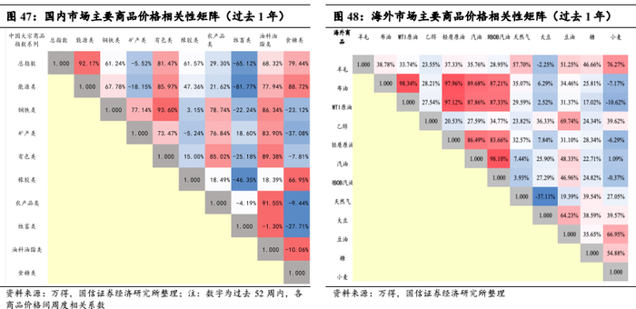 工业品和农产品价格关联:(1)与11月份相比,12月中国大宗商品价格指数的能源、钢铁、矿产、农产品等分项和总指数间相关性边际减弱,生产类商品(能源、钢铁、矿产、有色等)内部除能源与其他品种相关性进一步减弱,其他品种之间的相关性与11月份基本持平,生活领域中,农产品类、油料油脂类、牲畜类、食糖类价格与能源价格相关性均减弱,与其他生产类商品价格相关性较上月没有显著变化。(2)海外市场小麦、大豆、糖、天然气等价格与其他大宗商品价格间的联动效果较弱。