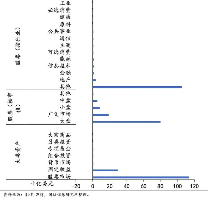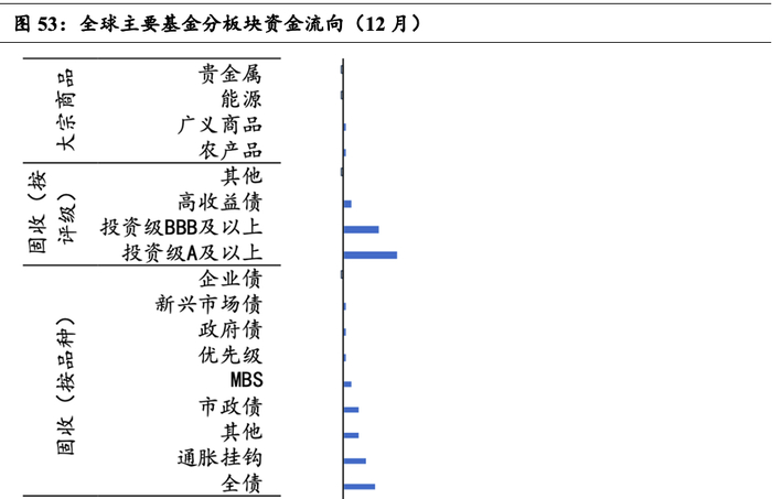 从主要基金的资金流动看资金12月对资产的排序偏好为:股票>债券>商品。(1)股票市场:股票的资金净流入远高于其他资产类别资金净流入的总额,其中大盘资金流入量占主要部分,广义市场次之,中盘、小盘流入量较小、规模相近,分行业来看,地产、金融、信息技术、能源是12月资金主要的流入项,工业、必选消费、健康、原料是主要的流出项。(2)债券市场:企业债基金出现小幅资金净流出,除此之外的债券基金都有不同程度的资金净流入,全债型基金净流入规模较大,其次是TIPS、市政债、MBS主题基金等。评级越高的品种流入量越高(投资级A以上>BBB级以上>高收益债)。(3)商品市场:12月各大宗商品主题基金仅有小额资金净流入、净流出,规模基本与上月持平。