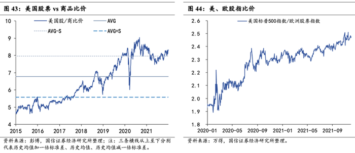 海外跨资产间比价:(1)12月美国股票和商品比价整体小幅上行,处在历史均值+1倍标准差之上。(2)美股和欧股间比值基本未发生改变,两者走势大体一致。