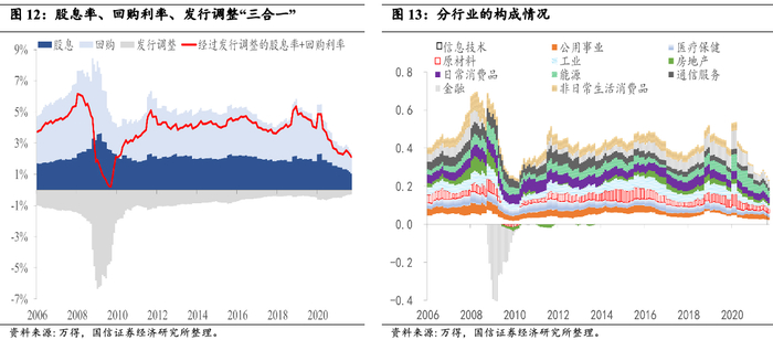 AQR框架能够引申出美股股息率、回购利率的计算。以标普500为例,可以计算股息率、回购利率,以及经过发行调整后的数值。另外,也可以看到分行业的贡献,如2008~2009年期间金融行业极为显著,地产行业和原材料行业也受到一定的影响。