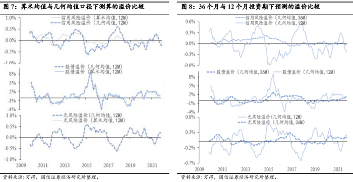无风险利率、信用溢价和股票溢价随着投资考核期限而变。以12个月为投资期计算的风险溢价,则与传统框架相差无几。这里股债溢价采用万得全A和中债全价指数,作为股票和信用债代表,万得全A样本主体的风险更低。几何均值复合口径的溢价波动性比算术均值略低。如果假设三年封闭期产品,36个月投资期下无风险利率、股债溢价、信用溢价较12个月情形均有所显著不同。