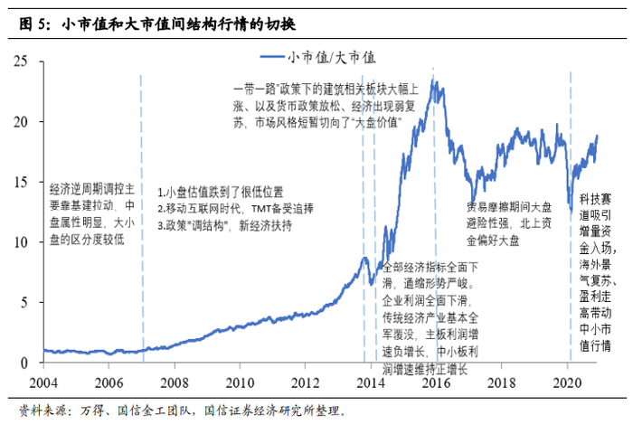 通常意义上的大盘指数、中小盘指数中企业市值规模常会有“凤尾”和“鸡头”式的交叉重叠,且大中小盘划分方式因人而异。部分观点也未必接受将中证500或者中证1000直接等同于中/小市值,但这对小盘、大盘行情的方向性划分并没有影响。按照国信金工团队运用的非线性规模指标量化方法来区分的大、中、小市值走势,其判定的大盘行情与中小盘行情与中证1000/沪深300的比值方法结论基本一致。金融危机以来国内历经了三次小盘行情(2008.1-2014.10,2015.1-2016.12,2021.2至今)和两次大盘行情(2014.11-2015.1,2017.1-2021.2)。