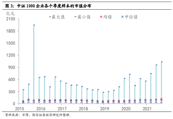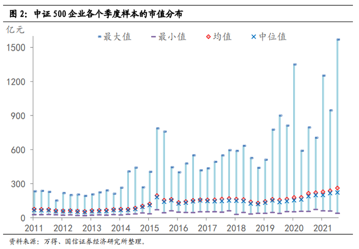 (1)市值是动态变化的,这里采用的是某一段时间内日均市值的测算方法,大盘指数中也不乏有小市值企业,小盘指数中也不乏有市值相对较大的企业。如2021年三季度末,沪深300指数中25%市值分位的企业市值约为505亿元,对应到中证500指数大概是92%市值分位数的企业。(2)采用中证口径的数据,大、中、小盘都是市值相对排名的概念。如果回溯到十年之前,2011年沪深300企业市值的中位值为206亿,中证500的市值中位数只有57亿;而到了2020年底中证500样本企业市值中位值就有216亿元,十年前的中小市值企业放到现在来看,绝对规模也不算小了。