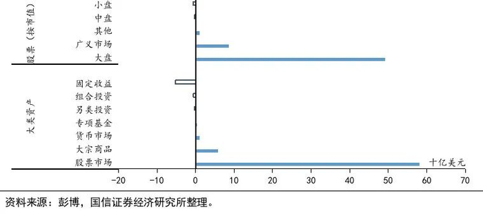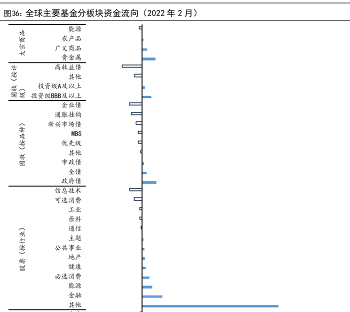 从主要基金的资金流动看资金2月对资产的排序偏好为:股票>商品>债券。(1)股票市场:股票的资金净流入远高于其他资产类别资金净流入的总额,但较1月大幅减少,其中大盘资金流入量占主要部分,广义市场次之,中盘、小盘出现资金净流出,分行业来看,金融、能源、必选消费、健康是2月资金主要的流入项,信息技术、可选消费、工业、原来是主要的流出项。(2)债券市场:债市整体出现较大程度的资金净流出,流出规模从大到小分别为企业债、TIPS、新兴市场债、MBS、优先级债型基金,政府债、全债、市政债型基金仍有净流入。投资级A以上和BBB级以上的品种资金净流入,而高收益债和其他品种净流出。(3)商品市场: 2月各大宗商品主题基金中贵金属、广义商品主题资金有一定流入,能源主题资金小幅净流出。