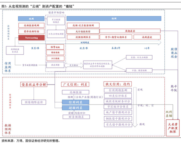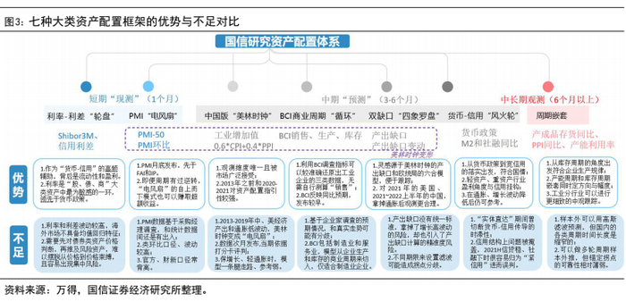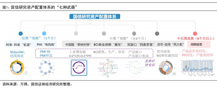 国信宏观固收团队在资产配置领域构建了七个体系,包括:(1)月内短期跟踪、分别对货币-信用体系和美林时钟进行提示与辅助研判的利率-利差“轮盘”、PMI“电风扇”;(2)以3-6个月中期维度跟踪观测,中国版“美林时钟”、BCI商业时钟“循环”、双缺口“四象罗盘”、货币-信用“风火轮”;(3)如果看6个月以上则需要中长期的周期嵌套框架。