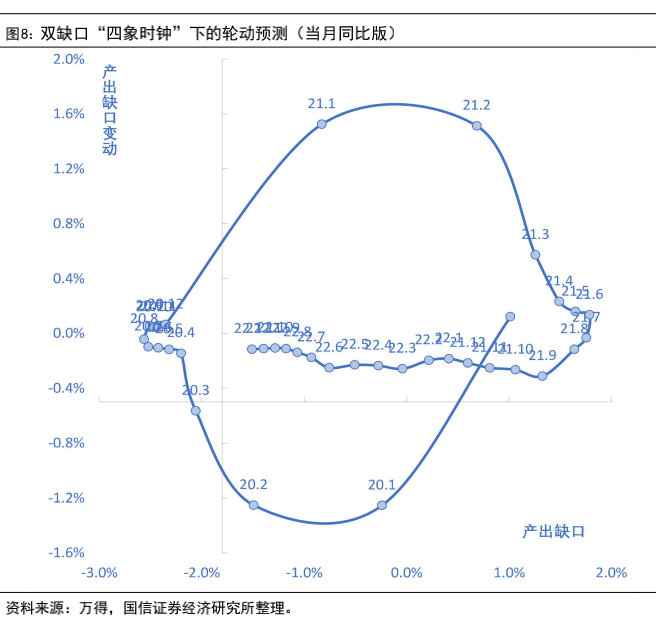 上面我们提到了用双缺口模型存在的问题,即消除了通胀制约的干扰,引入了产出缺口的不确定性,因此需要和更为权威的测算口径加以对比。根据刘哲希、陈小亮、陈彦斌(2022)在《宏观经济政策评价报告》基础上对潜在增速与宏观政策指数的测算结果,2019、2020、2021年产出缺口分别为-0.1%、-2.4%和-0.2%(2021年为两年平均),和我们算得的趋势是一致的。按照市场一致预期,2022年底产出缺口(工增同比算得)较2021年底产出缺口(工增两年复合同比算得)收敛,但还是处在负值区间。