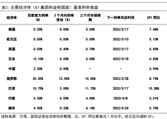 主要经济体通胀和货币政策跟进:美国2021年1月CPI同比录得较去年12月上涨0.44%,达到7.48%,再创1982年来新高,具体来看各分项,能源和汽车价格的上涨主导了通胀上行,自去年年初以来以来消费者对商品的强劲需求、供应链瓶颈、薪资上涨等因素持续催化通胀升温,逐渐紧张的俄乌危机进一步对全球通胀“火上浇油”,能源供应面临冲击,另外海运和航运方面受到的负面影响阻碍了供应链的恢复。发达经济市场中英国和欧元区CPI同比较12月均上涨0.1%,金砖国家中俄罗斯、巴西、印度CPI分别上涨0.34%、0.32%、0.42%。日本仍处在弱通胀水平,中国通胀较前期下降0.6%。主要经济体中,市场调查对未来三个月美国、英国、巴西、南非的货币政策有加息预期,近日俄罗斯为抵御资本外流紧急加息至20%,市场预期未来三个月会逐步恢复到原先的水平。