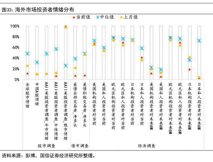 海外市场方面,我们测算了AAII、Sentix等口径投资者情绪指数,2月下旬海外投资者对中国A股看好情绪与1月末持平,对全球股市看好的情绪较1月末有所下滑,美股投资者调查显示当前美股熊市情绪非常强烈,中性情绪进一步减弱。美国机构投资者和个人投资者对当前的经济较为看好,看好程度与上月基本持平,欧元区、日本的机构投资者对当前经济比较乐观,个人投资者乐观情绪较上月均小幅上升。美国、日本投资者对未来半年经济看好程度有不同程度的下降,欧洲投资者相对乐观。