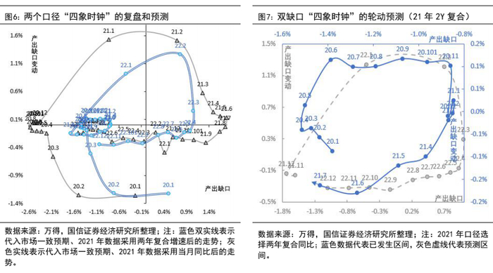 双缺口“四象时钟”在2022年还会奏效,上半年推荐顺序为:股票>商品>债券。2021年无论是国内市场的工业品价格通胀、美国市场的消费品价格通胀,价格问题都是G2的典型特征,但并非政策调控的重心——政策都在倾向保增长。今年上半年,美联储加息基本板上钉钉,货币实质性收紧应对通胀压力,因此美国的资产配置模型中可以重新考虑价格的因素,用价格和产出“双缺口”。国内市场在今年上半年,政策还是会以稳增长为导向,因此依据“产出缺口-产出缺口变动”的“四象时钟”还会发挥功效。我们按照两个条件给出四个口径的全年产出缺口预测:两个条件分别是2021年按照当月同比还是按照两年复合同比,以及代入的预测值是我们自己的预测还是市场的一致预期(彭博调查)。结果显示采用哪个口径的预测影响不大,但2021年数值采用两年复合增速、2022年初改为当月同比间过渡的“衔接”期间产出缺口出现显著上扬。我们认为测算产出缺口绝对水平时需要考虑2021年的基数效应,但2022年初缺口变动方向上要注重跨年衔接,整体看上半年还是处在产出缺口回落的阶段。