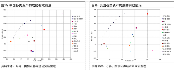 我们遴选了中美股票、债券、商品三种类别的资产,皆为本币计价的总回报类指数,在不同约束条件的情景下构造出相应的风险-回报组合。假设条件如下:(1)每类明细资产占比不超过15%。(2)年度回报按照最乐观~最悲观设定为25%、18%、7.5%(中性)、-14%、-30%,对应的概率分别为5%、20%、50%、20%和5%。(3)中国和美国无风险利率均按照12月的十年期主权债收益均值,在上述五类情景下赋予各类资产不同权重,最终得到有效前沿如图37-38所示: