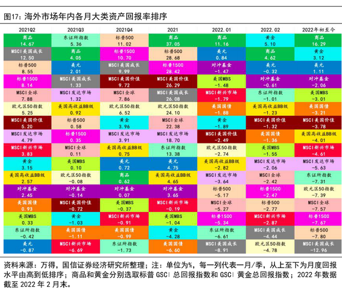 2022年2月海外大类资产大体排序:商品>债券>股票。前三甲的品类:商品、黄金、美元。(1)今年2月以来,俄乌危机对国际资本市场造成较大冲击,股票和债券延续了1月份的弱势表现,仅黄金、商品录得正月度回报率,大宗商品价格延续了上个月的反弹行情保持在回报率排行榜首位。(2)权益市场方面,地缘局势风险叠加美联储加息压力,全球股市剧烈震荡,标普500指数和标普1500指数分别录得-2.77%、-2.47%的月度回报率。分区域来看权益市场:日本/美国>新兴市场>欧洲,欧元区受俄乌危机波及的可能性较大,大量资本流出欧元区股市,欧元区50指数录得-4.78%,位列月度回报率排行榜末位。(3)债券方面,分品种看:高收益>国债>MBS。整体看信用债要好于利率债,但均录得负回报率。(4)商品方面,GSCI商品总回报指数收益率录得4.62%,商品价格主要受原油价格拉动,在供应紧张和地缘政治影响下2月原油价格维持了1月的上行趋势,以美国为首的西方经济体对俄罗斯实施制裁措施进一步抬升了国际油价、天然气价格预期,同时避险需求攀升导致国际投资者涌入黄金市场,黄金价格快速上行,GSCI黄金总回报指数收益率录得5.10%,位列月度回报率排行榜首位。