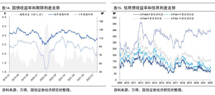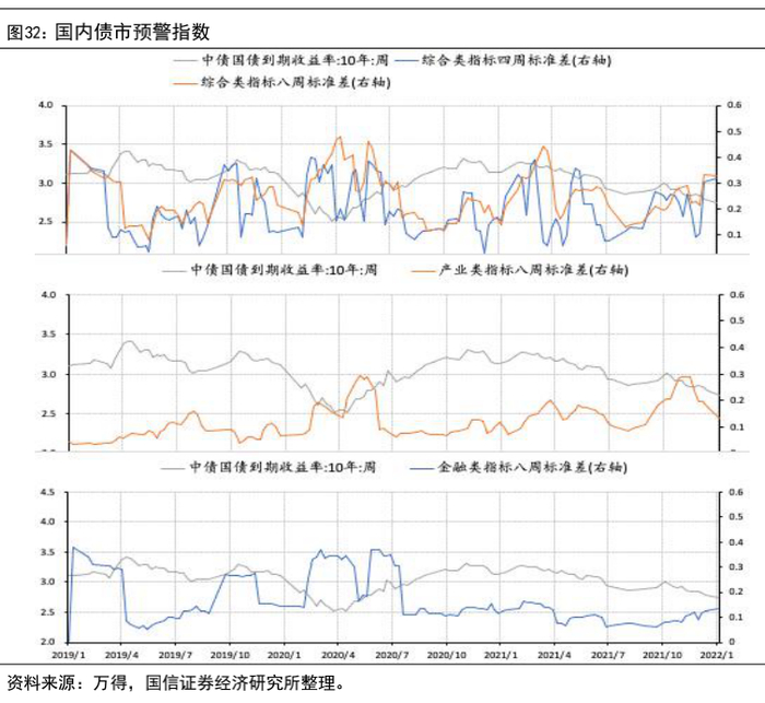 根据国信银行团队的预测,2022年M2增量(不含货基)约20.8万亿元,对应的M2增速为8.8%;全年社融增速约为10.8%,新增社融34万亿元,较2021年的信用环境更宽松(具体请参见《重提稳增长——2022年社融和 M2 展望》,2021.12.14)。节奏方面,大概率呈现前高后低的局面,根据国信宏观团队的预测,M2和社融年内高点分别出现在二、三季度。因此,今年上半年大致处在宽货币和宽信用的状态,对债利空,对股和商品利好。历史中股、债、商牛市的概率分别为83%、33%和80%。
