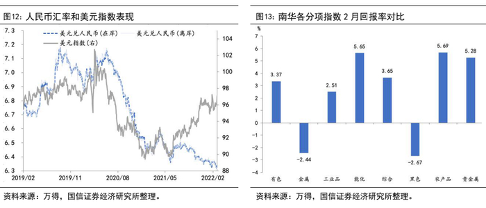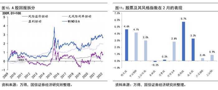 2月国内大类资产的表现可以概况为:股市小幅上行、商品价格飙升、债市整体走弱、人民币仍具韧性。(1)股市方面:截至2月28日,中证500上涨4.1%,上证综指上涨3.0%,深证成指上涨1.0%,上证50上涨0.9%,沪深300指数上涨0.4%,创业板指下跌1.0%。中信风格指数下各个板块全月回报排序为:周期>稳定>成长>消费>金融,周期股录得最大正回报率,仅金融股录得负回报率。(2)债券方面:2月中债口径十年期国债到期收益率上升7.5bp至2.78%。(3)商品方面:地缘政治风险因素推动主要商品价格强势上行,上期所原油领涨15.7%,上期所黄金上涨5.1%,南华综合指数上涨3.7%,工业品指数上涨2.5%。(4)汇率方面:截至2月28日,美元兑人民币汇率中间价收于6.3222,在美元指数走强的背景下人民币依然具有韧性。