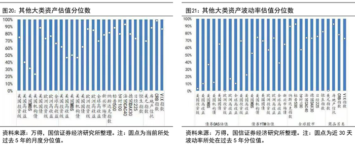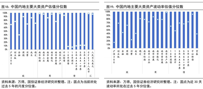 中国和全球市场股、债、汇、商价格、波动率所处在过去五年的分位点显示:(1)从价格角度考虑(债券收益率视为价格反向指标),国内市场的股/债/商估值整体偏贵,股票中各风格板块估值均小幅上行,周期、成长股估值水平位于过去五年间85%以上分位值。债券价格估值均出现不同程度的下行,除金属外各商品品种估值均高于前期,贵金属估值相对较低。股票、债券和商品波动性普遍与前期持平或有所减弱。(2)全球市场方面,股票市场中,各指数估值较前期普遍下行,中国香港的恒生指数估值跌至过去五年间最低水平,除法国外其他市场股指估值均跌至过去五年间90%以下的分位值,全球各类债券估值较前期下行。