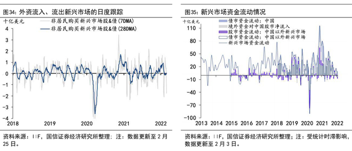 根据国际金融协会(IIF)统计的新兴市场资金流向,2月1~27日海外非居民部门购买新兴市场股票净卖出9.8亿美元,新兴市场债券净流入19.7亿美元,对新兴市场股、债净流入9.9亿元,较上个月急剧减少。