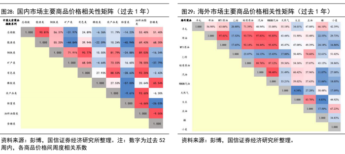 工业品和农产品价格关联:(1)与1月份相比,2月中国大宗商品价格指数中能源、钢铁、矿产分项和总指数间相关性边际减弱,其余分项和总指数间相关性增强,生产类商品(能源、钢铁、矿产、有色等)内部相关性与前期基本持平,生活领域中,农产品类、油料油脂类、牲畜类、食糖类价格与其他生产类商品价格相关性较上月有增有减,整体来看没有显著的变化。(2)受地缘政治紧张影响,全球大宗商品全线上涨,大宗商品价格间的相关系数普遍增强,尤其是大豆、小麦等。