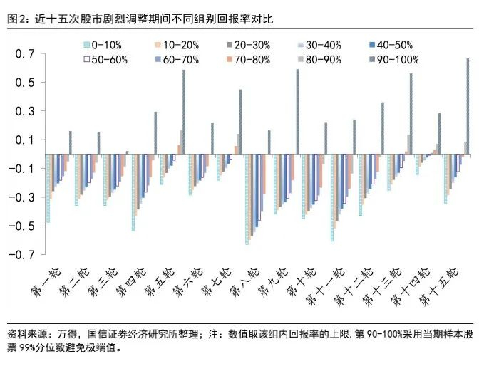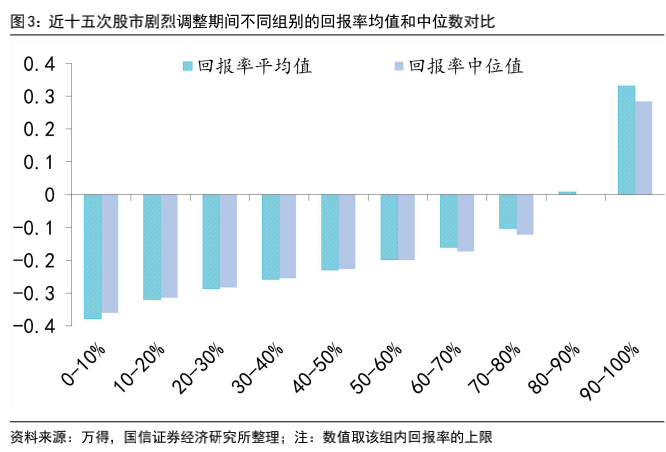 按照各组个股在市场剧烈调整时的平均回报率、中位回报率来测算,基本上第十组是赚钱的,第九组处在盈亏平衡线上,而第一组到第八组是亏钱的。无论是从下跌个股的比例,还是整体跌幅,都是符合传统意义上“超预期下跌”认知的。