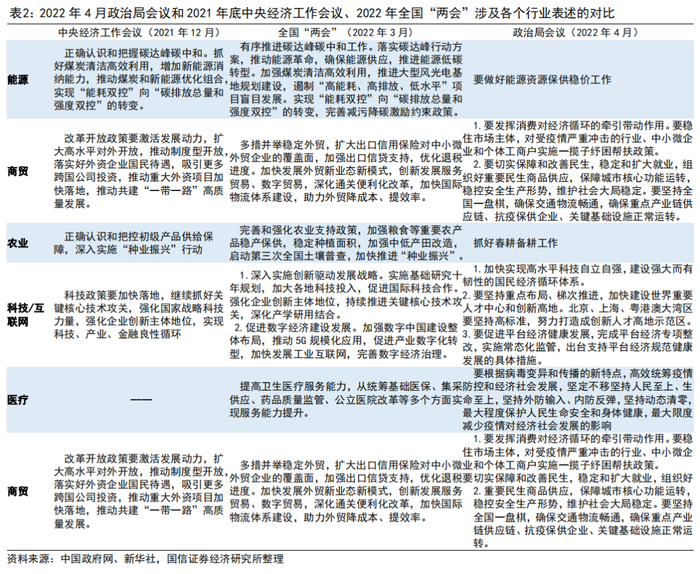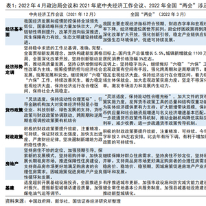 我们对比了4月政治局会议和今年3月全国“两会”、去年底中央工作经济会议在宏观经济基本面、财政和货币政策、农业和能源等领域的定调表述,如表1-2所示。
