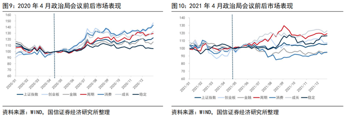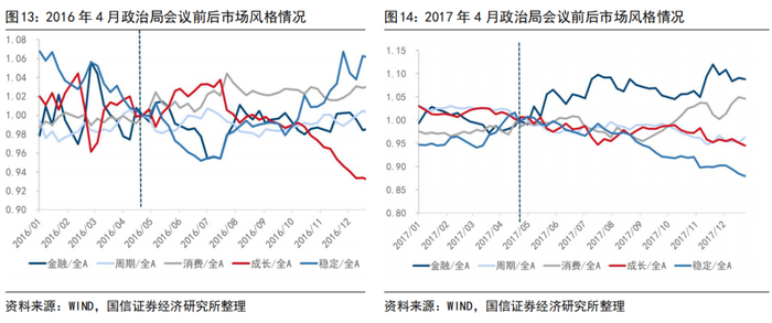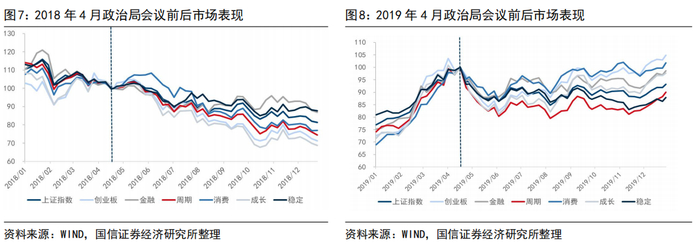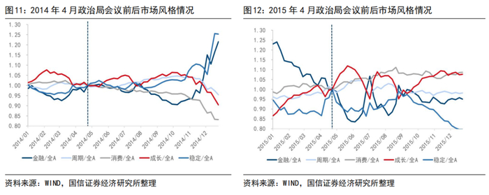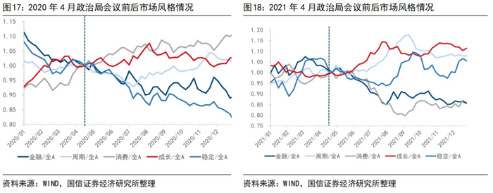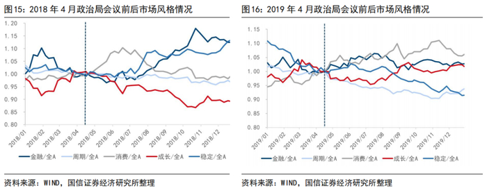 3.从A股风格上看,4月会议未必会形成A股风格切换的拐点。我们以政治局会议前后,各风格与万得全A的相对趋势作为刻画市场风格切换的观测指标,2013年至今,除了2018年成长风格出现“倒V型”拐点外,其余年份中,会议均不改前后一个季度内的市场整体风格。