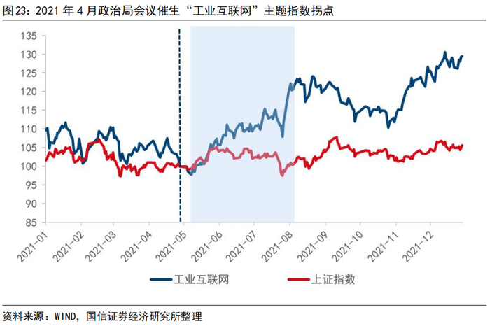 主题投资角度,当年会议重点议题、政策连续性较强的热点主题均值得关注。(1)从政策连续性角度看,“一带一路”主题具备较强连续性。2020、2021年的会议均提及“一带一路”,其中2020年会议强调,“要坚定扩大对外开放,保障国际物流畅通,把好防疫物资出口质量关,推动共建‘一带一路’高质量发展”;2021年会议则强调“通过加快建设各类高水平开放平台,推动‘一带一路’发展”。近两年来,“一带一路”主题指数的表现持续优于上证指数。(2)“共同富裕”作为近两年4月政治局会议强调重心之一,在A股市场中表现在主题指数的连续性与爆发性并存上。2020年会议强调“加大‘六稳’工作力度,通过‘六保’维护经济发展和稳定社会大局,确保完成决战决胜脱贫攻坚任务,全面建成小康社会”。2021年会议强调,“制定共同富裕行动纲要,以城乡居民收入普遍增长支撑内需持续扩大”。会议结束后的2个月内,“共同富裕”相对大盘跑出明显超额收益。(3)除了近2-3年政治局会议上提及的政策连续性较强的主题,当年会议重心同样值得关注。如2021年4月政治局会议强调,“要积极发展工业互联网,加快产业数字化。伴随企业上云需求不断提升,工业互联网或迎来下游场景爆发阶段”。在海外工业互联网产品导入阶段基本完成后,2022年-2024年或将成为工业互联网市场规模演变的关键时期。2021年政治局会议前瞻性地强调了工业互联网,亦在市场形成了一定的预期共识,工业互联网主题指数在5月初迎来拐点,4月30日至8月31日,涨幅达22%。