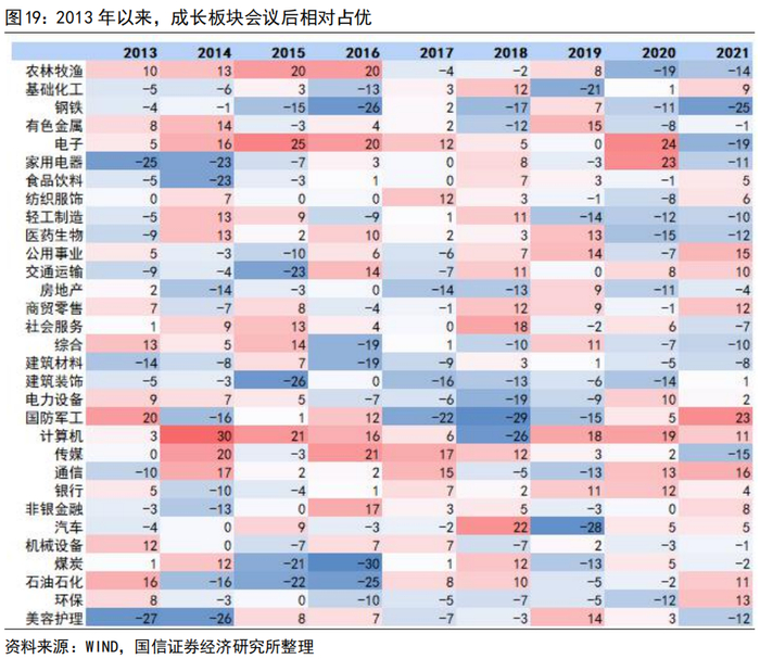 2.根据历年4月会议后A股的平均表现来看,市场整体相对稳定。我们以上证指数会后第1个、5个、10个、20个、30个交易日涨跌幅作为统计口径,2013年以来,除2015年的明显上涨和2019年的明显下跌外,其余年份市场整体情况相对稳定,会后30个交易日区间涨跌幅均在3%以内。