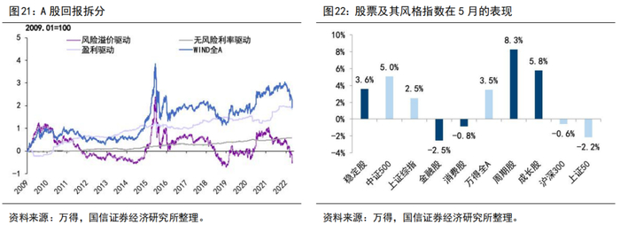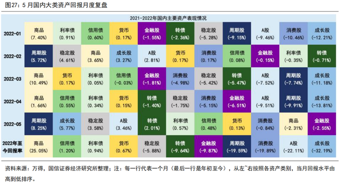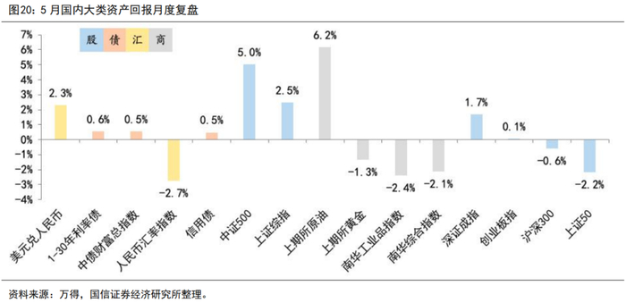 5月国内大类资产的表现可以概况为:股市结构性反弹、商品普跌、债券利率下行、人民币承压。(1)股市方面:截至5月26日,中证500上涨5.0%,上证综指上涨2.5%,深证成指上涨1.7%,创业板指上涨0.1%,沪深300指数下跌0.6%,上证50下跌2.2%。中信风格指数下各个板块全月回报排序为:周期>成长>稳定>消费>金融,周期股录得最大正回报率,为8.3%,金融股录得最大负回报率,为-2.5%。(2)债券方面:5月中债口径十年期国债到期收益率下降8.1bp至2.76%,中债财富总指数录得回报率0.5%。(3)商品方面:除原油外其他大类商品价格普遍下行,上期所原油上涨6.2%,南华工业品指数领跌2.4%,南华综合指数下跌2.1%,上期所黄金下跌1.3。(4)汇率方面:截至5月26日,美元兑人民币汇率中间价收于6.6766,在美元指数走强的背景下人民币持续承压。
