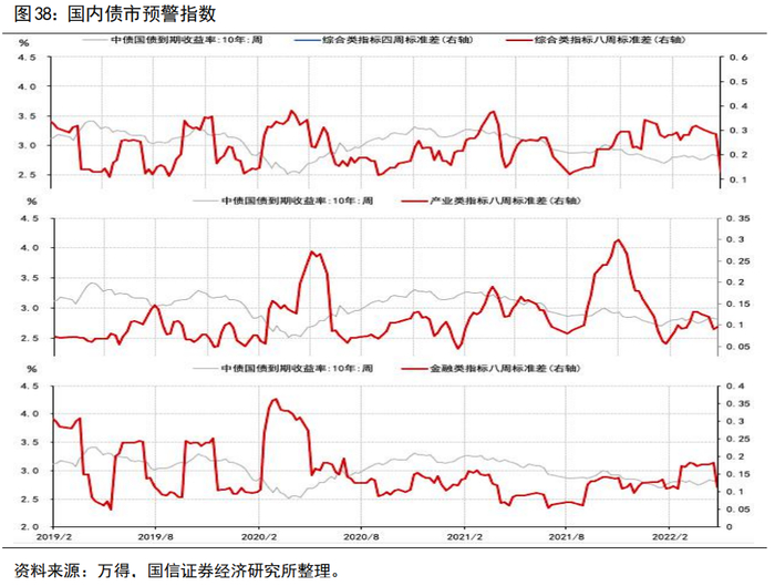 我们构建了债市情绪指数对市场的情绪进行捕捉,实际交易中产生的溢价、流动性指标衡量市场上的投资者情绪,最终选取了期货、现券、信用3大类、共计12个二级指标来计算情绪指数。此外,我们也构建了债市预警指数对债市行情的拐点进行预测,在构造预警指数时参考了高频的金融类指标,同时加入产业类价格、产出等方面的指标辅助前瞻债市波动,最终选择了7个金融类指标和5个产业类指标,采用正交分解的方法构建了金融、产业、综合债市预警指数。今年年初以来,债市情绪指数从3年均值以上的位置一路下行至三年均值减两倍标准差的下限,并于3月中旬触底后反弹,然而4月开始债市情绪指数再度大幅下行,再次触底回升释放出十年期国债收益率下行信号。